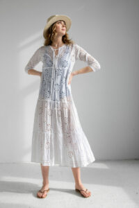Relax in this easy cotton eyelet lace maxi dress. It works as a beach cover or as a dress with a body skimming slip.