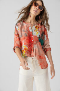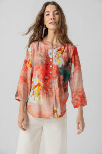 Thus is a wonderful top to make for a more cheerful day. The bright coral colors are lively yet softly blended. This is a shirt you can feel good in any day with jeans or white trousers, with accessories or casually worn with flip flops.
