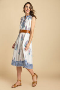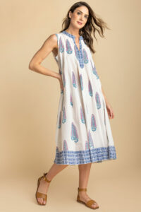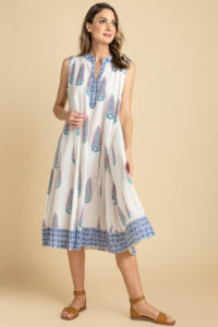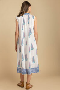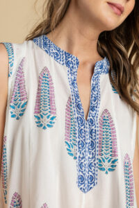 Here comes the sun. Astoria is a special combination of 2 hand blocked prints. The flirty and carefree style in soft cotton make this perfect for a summer day (or evening). The hand embroidery at the back is a surprising and unique detail.