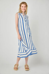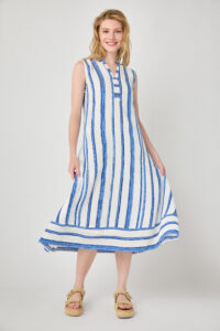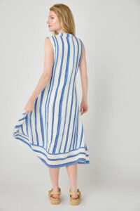 Feel comfortable in this striking blue stripe dress. The flared skirt makes it perfect for hot weather. It’s also great with a cardigan or jacket when it gets cool.