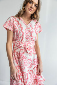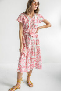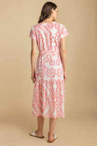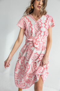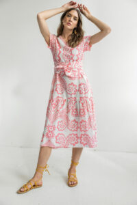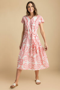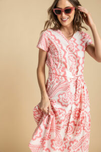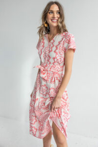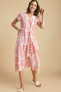 Chantel is a lightweight, comfortable summer dress. Put on some sandals and you are ready to go anywhere. The belt is separate and gives it a different look. Throw on a cardigan or jeans jacket and short boots for another look.