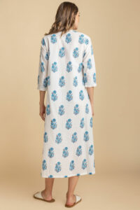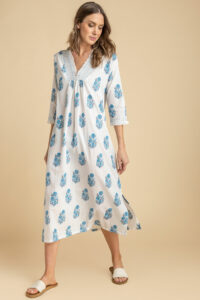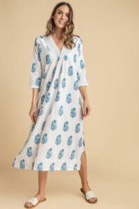This beautifully shaped dress features a lovely V neck with a small ruffle and embroidery. It’s perfect for the beach and will take you straight on to lunch.