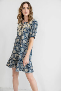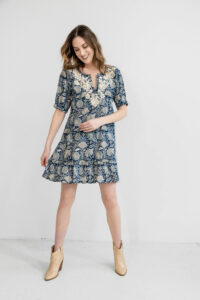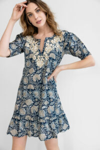 Corinne is a beautiful blend of colors in a detailed block printed dress. It features elbow length balloon sleeves and a tiered short skirt. The signature hand embroidery adds a unique finishing touch.