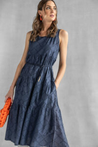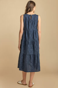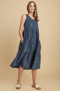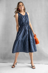 Elinor is that easy, comfortable, wear anywhere dress you’ve been looking for. The cotton embroidered eyelet is versatile. The sleeveless style us good for warm weather and looks great with a jacket or shawl in cooler weather. Pockets are a bonus!