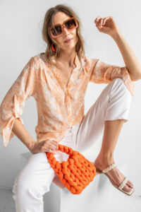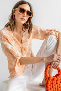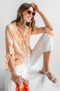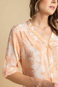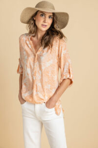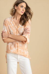 This shirt is a multitasker! It’s washable silk crepe and travels well. The sleeves can be long or buttoned up to half length. The shirt tail bottom can be tucked in or just left out. Accessories are easy to add, giving it a more finished look for evening. Jeans, white or blue, trousers, shorts, heels or sandals or flats, all work well with Katherine.