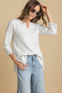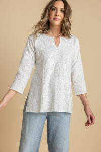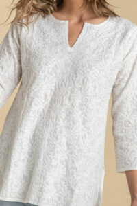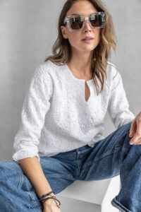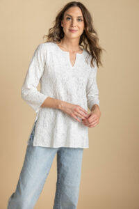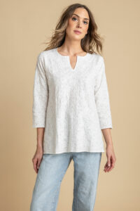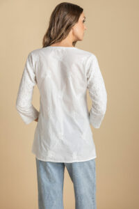 Every wardrobe needs a great white shirt. This is our classic cotton hand embroidered shirt. It is the perfect mix of pretty and practical. Pair with your favorite pants and dress it up or wear it casually with shorts or jeans.